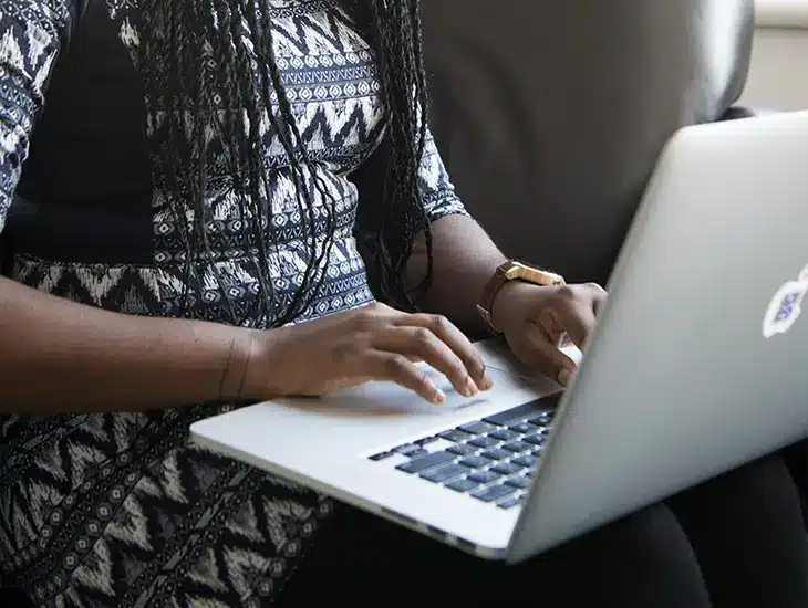 A woman engrossed in her laptop on a cozy couch, reading an important letter from Symphonic’s CEO.
