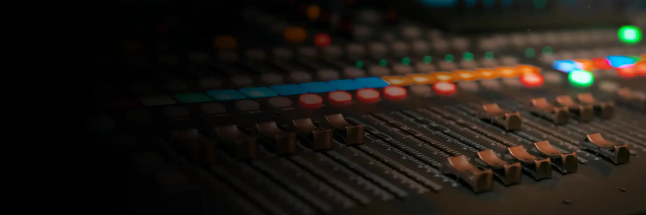 A close-up of a dimly lit audio mixing console, with various buttons, knobs, and sliders illuminated by colorful lights, captures the essence of seamless video distribution.