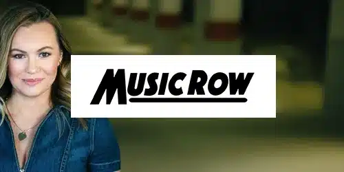 A woman stands next to a «Music Row» sign, partially obscured by the press of the sign. The background is blurred with indistinct details.